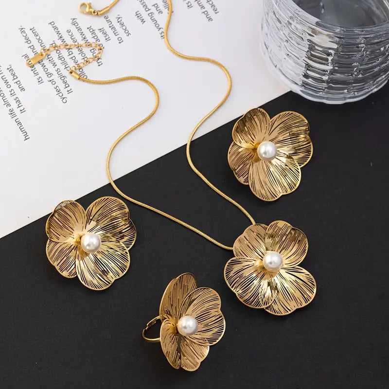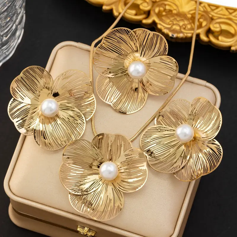 Discover timeless elegance with our Luxury 4-Piece Golden Stainless Steel Pearl Jewelry Set. Crafted from high-quality stainless steel with stunning white pearls, this versatile jewelry collection includes earrings, a necklace, and a ring, perfect for daily wear or special occasions. The trendy floral design adds a delicate, feminine touch, making it ideal for gifting or elevating your personal style. Durable and stylish, our pearl jewelry set offers an effortless way to enhance any outfit with sophistication.